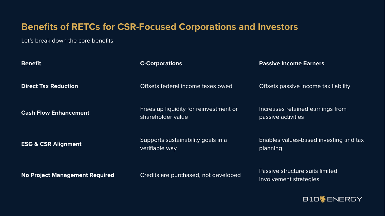 In an environment where corporate social responsibility (CSR) and tax strategy are increasingly intertwined, Renewable Energy Tax Credits (RETCs) offer a unique opportunity for C-corporations and high-net-worth individuals with significant passive income. By purchasing RETCs, these entities can reduce tax liability while simultaneously demonstrating environmental stewardship.